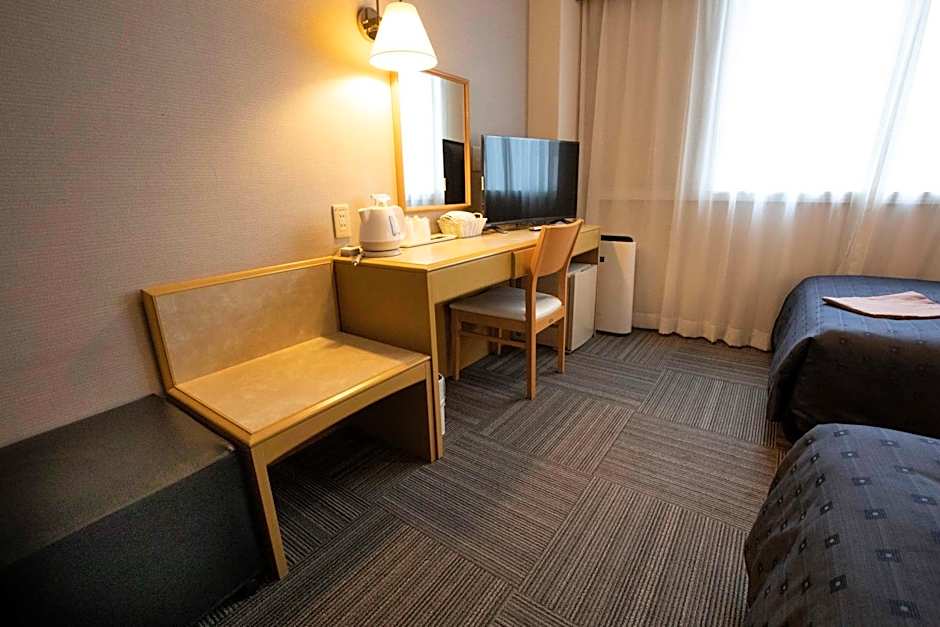 Simply furnished room with a wood desk, a mini-fridge and an electric kettle with green tea. Slippers, a toothbrush set and a hairdryer are provided in the private bathroom.